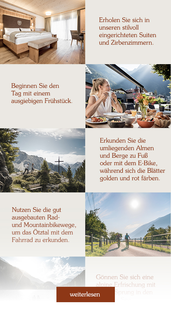 Oetz und das Ötztal zeigen sich zu dieser Jahreszeit von ihrer schönsten Seite. Angefangen von der atemberaubenden Farbenvielfalt der Natur bis hin zur klaren Fernsicht auf den Bergen. Die warmen Temperaturen tagsüber sind ideal für zahlreiche Outdoor-Aktivitäten und abends lässt es sich in unserem Wellnessbereich oder im beheizten Freischwimmbad wunderbar entspannen.