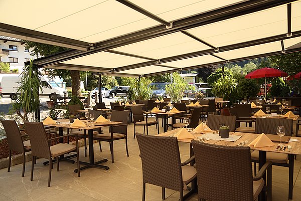 Somit können unsere Halbpensions-Gäste ihr Frühstück und Abendmenü, bestens geschützt von Wind und Wetter, im Freien genießen.